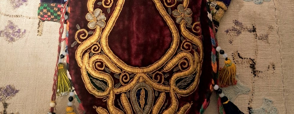 ¹• Suzani: (From the Persian suzan, meaning "needle"). A decorative hand-embroidered textile, traditionally made of silk or cotton. A cornerstone of Uzbek heritage, the Suzani was historically created for dowries and symbolizes fertility, protection, and the strength of family bonds.²• Zarduzlik: The ancient art of gold embroidery. In Bukhara, this was once a prestigious courtly craft reserved for the robes of the Emir and his inner circle. It is characterized by the use of gold and silver threads stitched onto deep velvet.³• Kala-push: (Literally "to wear on the head"). A term used specifically in Bukhara to describe the traditional headdress. While similar to the duppie, a Bukhara Kala-push is often distinguished by its use of vintage fabrics or refined gold embroidery.⁴• Duppie (or Doppa): The traditional Uzbek skullcap, usually square or round in shape. Styles vary by region (such as Chust, Tashkent, or Fergana), with different patterns and colors indicating the wearer's origins or social status.⁵• Ko’rbo’z: A sturdy, hand-woven cotton fabric. Its historical significance in Bukhara lies in its production by blind artisans, who have preserved this tactile and precise weaving technique for centuries.