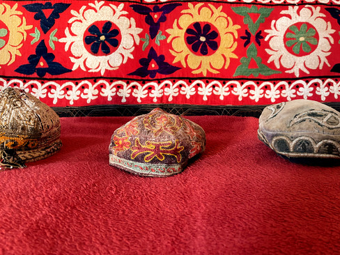 Mirzo paused to show me his collection of Kala-push³ (or duppie⁴), the traditional Uzbek skullcaps he crafts by hand. "In Bukhara, we call them Kala-push—from Kala (head) and push (to wear)," he noted. These caps are talismans; the popular Chust variety, with its white embroidery on black, often features the kalampir (pepper) or ram’s horn to protect the wearer from the evil eye. Mirzo’s own creations are remarkably soft, made from vintage silks and cottons that feel like a whisper of history.